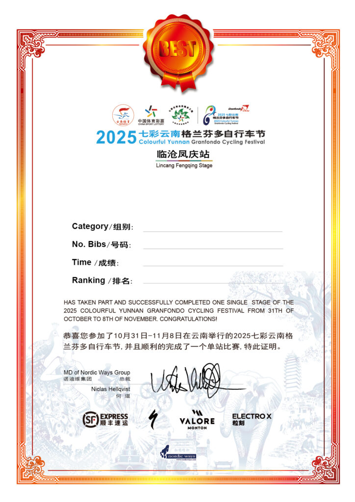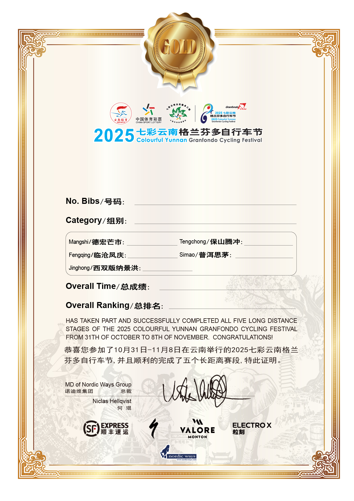 以下是2025七彩云南格兰芬多自行车节的奖金概况。和往常一样,还有40岁以上和50岁以上的男性和女性的总排名以及团队排名(关于团队比赛的详细信息,请参阅比赛规则)。根据完成的阶段数,所有长距离组别的完成者还将获得金证书、银证书或铜证书(金证书=完成全五站的选手,银证书=完成四站的选手,铜证书=完成三站的选手)